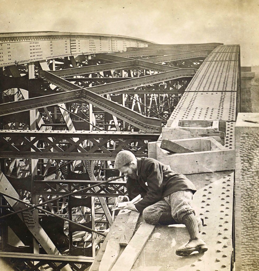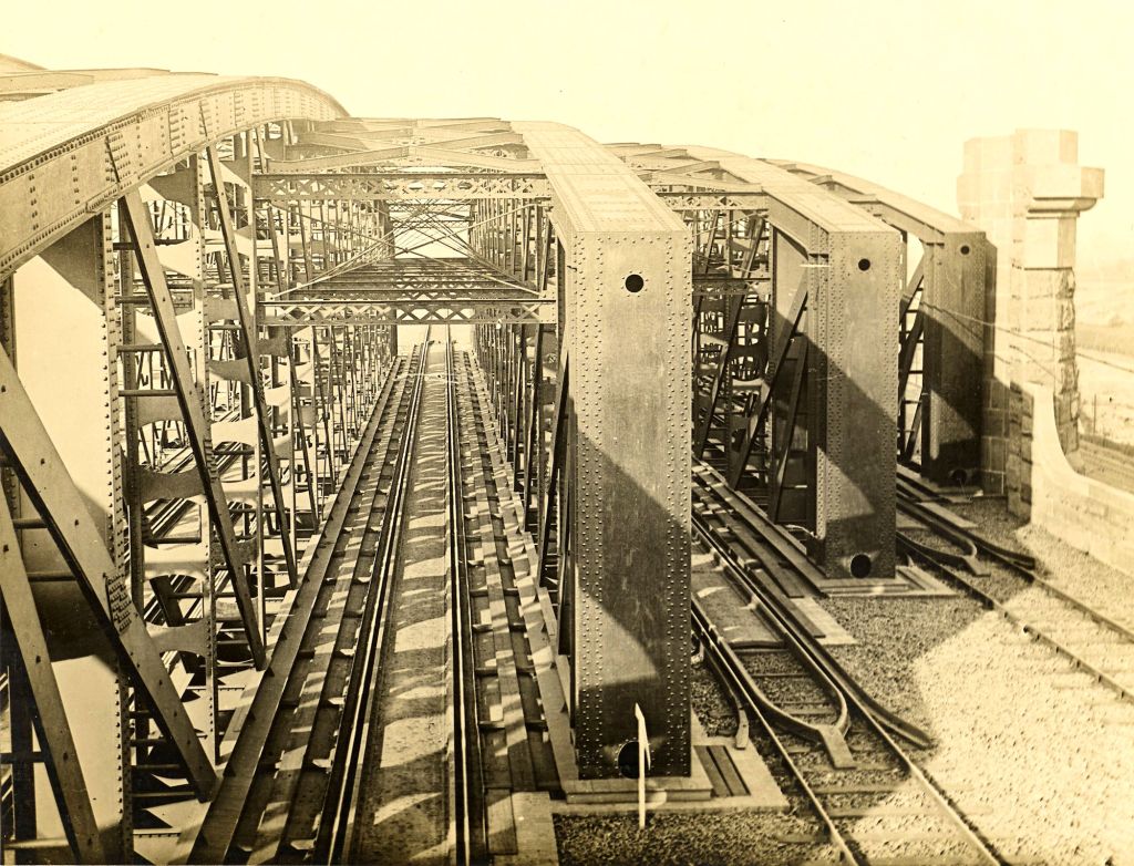 The construction of the main girders is depicted in this photograph, taken from the top of one of the abutments. The interlacing of the various members is apparently very confusing, but a careful study of this page will convey a slight idea of the vast amount of work in structures of this kind. The rounding of the girder tops should be noticed, and it must be remembered that the view is taken obliquely, looking through four of the main girders.