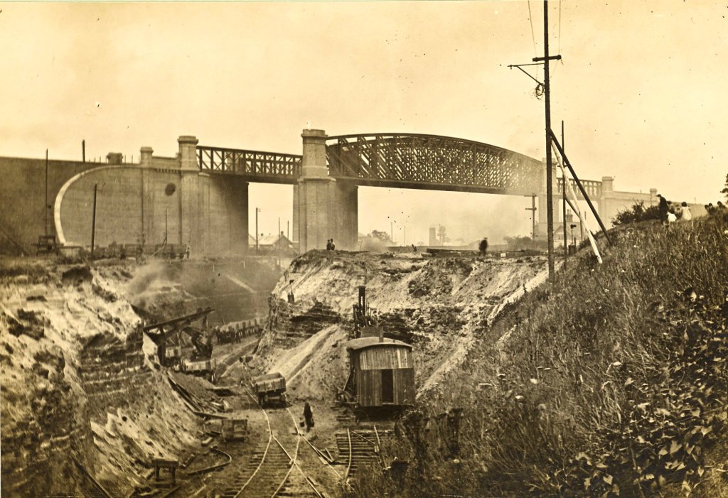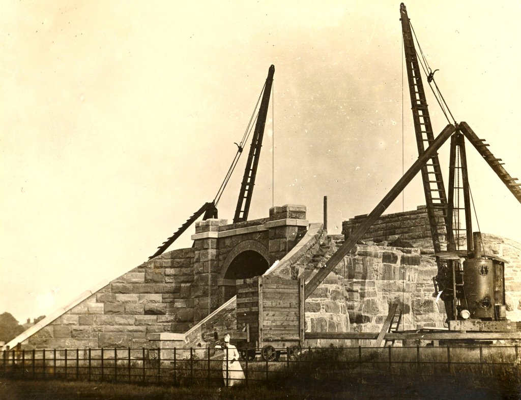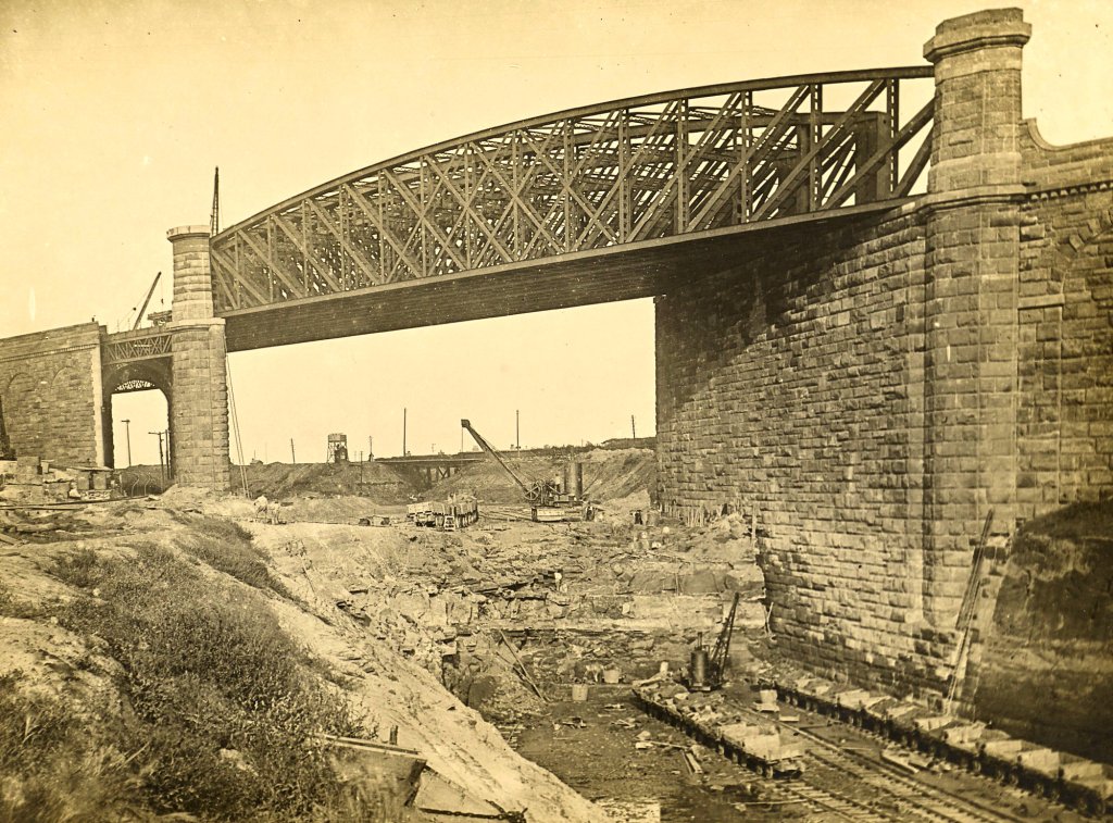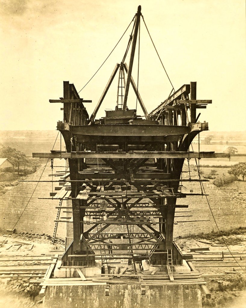 The mode of constructing heavy masonry bridges on the railway deviation works is here shown. The foundation having been laid, the abutments and wing-walls are carried up by means of the two large cranes; and when all is safely arched over, the tip head is carried across the new work, and the embankment pushed forward to join the old track. Following the practice of the L. & N. W. Railway Company, the abutments in this and other bridges on their system have been built in sandstone, with arches turned in blue brick. But on the Cheshire Lines deviations the exact converse has been adopted, the abutments being in brick and the arches in stone.