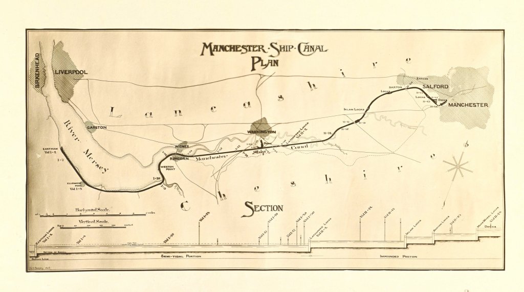 The Manchester Ship Canal is a 36-mile-long (58 km) inland waterway linking Manchester to the Irish Sea. The idea for a shipping lane to the inland town of Manchester came about because traders didn’t wish to continue paying Liverpool Docks and the railway companies to transport their goods to the city.