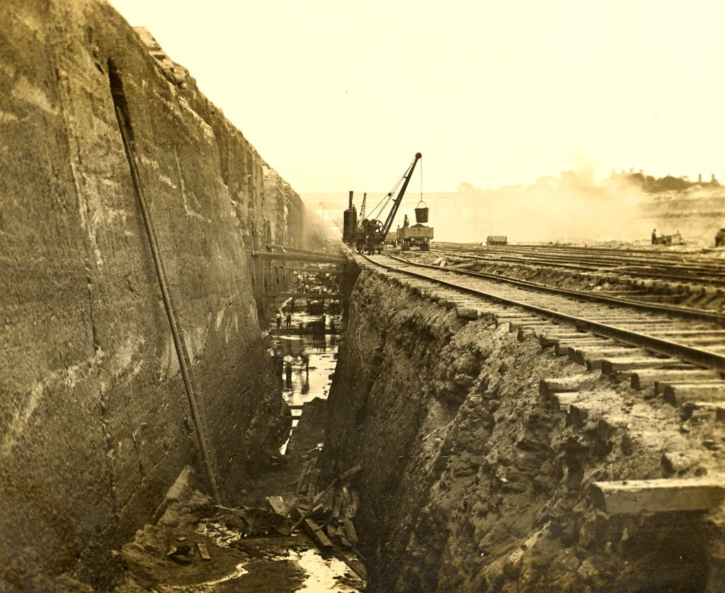 These locks are situated 21 miles up the canal from Eastham, or 14 1/2 miles from Manchester, and form the head of the semi-tidal portion of the work. As in the case of Eastham, the deep cutting here is for the footings of the concrete lock wall, and the solid rock on the right will subsequently have to be removed to form the lock basin.