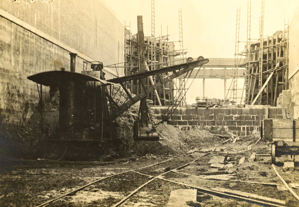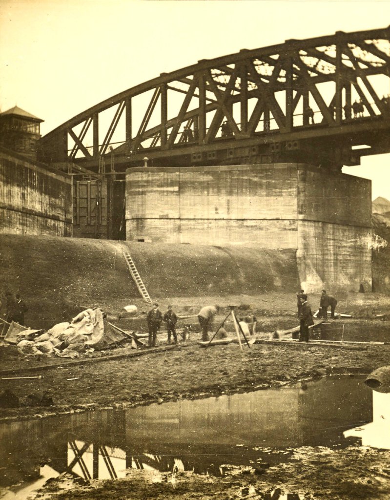 Once the concrete walls had been built in the trenches, the solid core had next to be removed, so that the concrete floor of the lock chamber might be laid. The present view shows a steam navy at work removing the last of this rock into tip-waggons. The railways seen here , as also throughout the work, are the ordinary standard gauge of 4 ft. 8 1/2 in. The stone wall across the head of the lock forms the lift at this point, and rises 16 1/2 feet above the lock bottom, corresponding with the difference in water level between the upper and lower ponds. The head gates are almost completed, and the lock walls built up to their full height. The double bridge in the background is a temporary structure, carrying a farm road and a watercourse across the cutting.