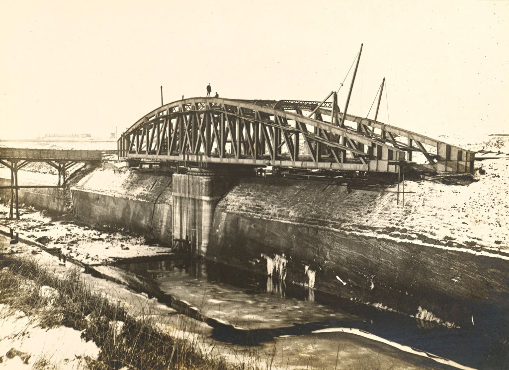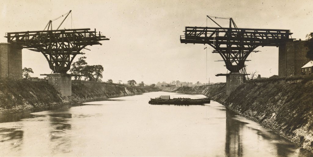 This is the second fixed road bridge over the canal and is identical in design with the one at Latchford, shown in its finished state above. The present view was secured when the bridge was about half completed and shows very clearly the great advantage of this form of structure. It will be noticed that the bridge is being erected after the cutting has been filled with water, and further, that no temporary staging is needed. The brick and concrete foundations having been built up from below the bed of the canal, the steel framing is commenced. By constructing the arms or cantilevers symmetrically, as here shown, the work remains balanced on its somewhat narrow base. The shore-ends of the two cantilevers are afterwards secured below road level, in order to counterbalance the weight of the girders connecting the arms extended over the water. These independent girders are put together on pontoons and hoisted into position by the two derrick cranes shown in the photograph.