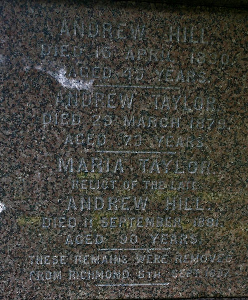 Picture of family marker for Maria Taylor (nee Woods, Hill), Andrew Hill & Andrew Taylor at Beechwood Cemetery, Ottawa on Malloch plot. Author: Ian Furst. Used under the Creative Commons Attribution 3.0 Unported license.