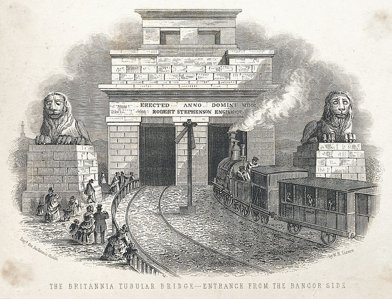 A view of the entrance to the Britannia Bridge from the Bangor side, showing a steam train entering the bridge, people watching, two large stone lions and an inscription relating to the engineer, Robert Stephenson. The scene is from around 1850. Image used under Creative Commons licence.