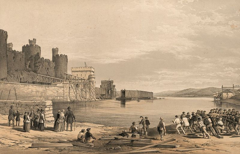 A lithograph entitled “Conway Bridge” showing the second wrought-iron box girder tube being floated into position, c. September 1848. Image used under Creative Commons licence.