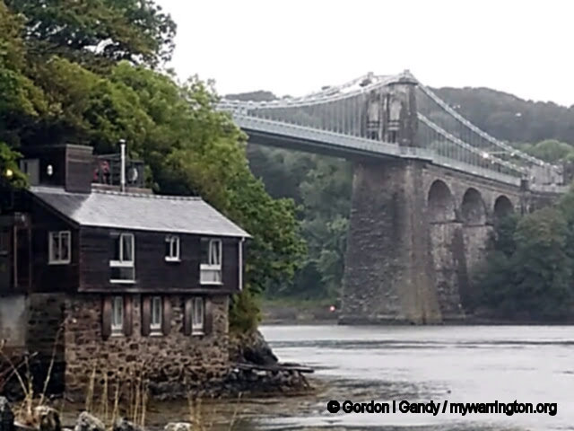 A view north from Menai Suspension Bridge, with Anglesey on the left separated from the mainland on the right. Before the bridge was built, the only way to cross was by boat. The tidal flow made it a very difficult journey.