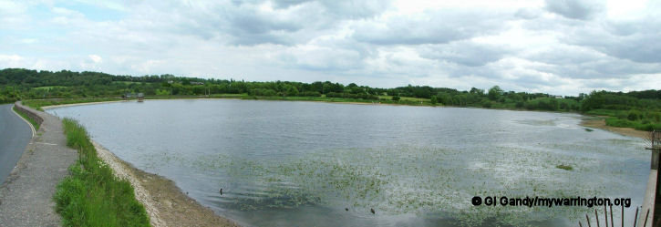 SJ 607864. A disused man-made lagoon between the Manchester Ship Canal and the River Mersey. The banks are clothed in reed and willow scrub which provides habitat for reed bunting and warblers.