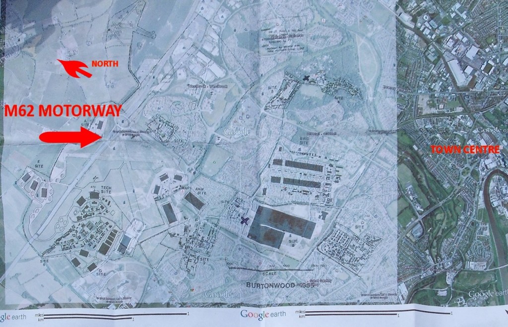 A plan of RAF Burtonwood superimposed over a Google Earth aerial map. I have marked a couple of things for reference.