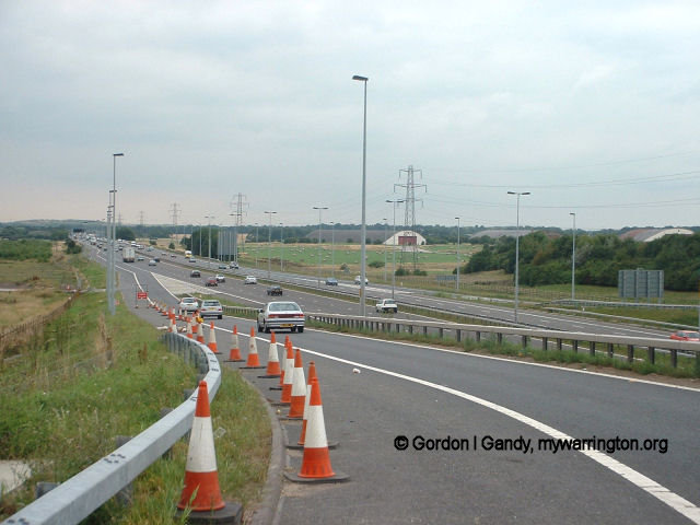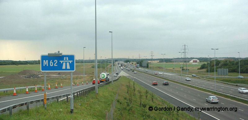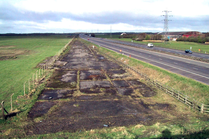 View westbound at the site of M62 J8, showing the last remaining part of the Burtonwood main runway before construction of the junction.