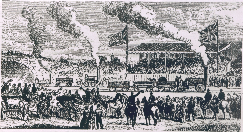 Rainhill Trials from the Illustrated London News. In the foreground is Rocket and in the background are Sans Pareil (right) and Novelty. Used under the Creative Commons CC0 License.