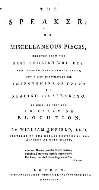 His most successful work, however, was The Speaker (1774), an anthology of literary extracts intended to teach elocution, and produced first for his Warrington pupils. He published a sequel, Exercises in Elocution in 1780. Enfield’s Speaker remained in print until the middle of the nineteenth century and inspired other anthologies, such as Mary Wollstonecraft’s The Female Speaker.