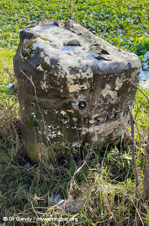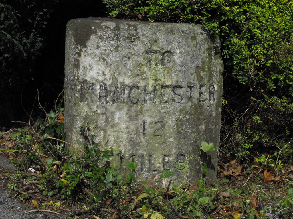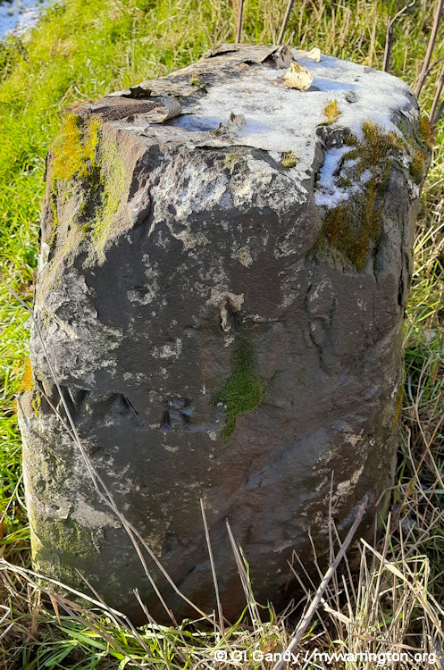 The third milestone is on Manchester Road in Hollins Green. It was erected before 1848/9 and first listed on 6 Mar 2008.
