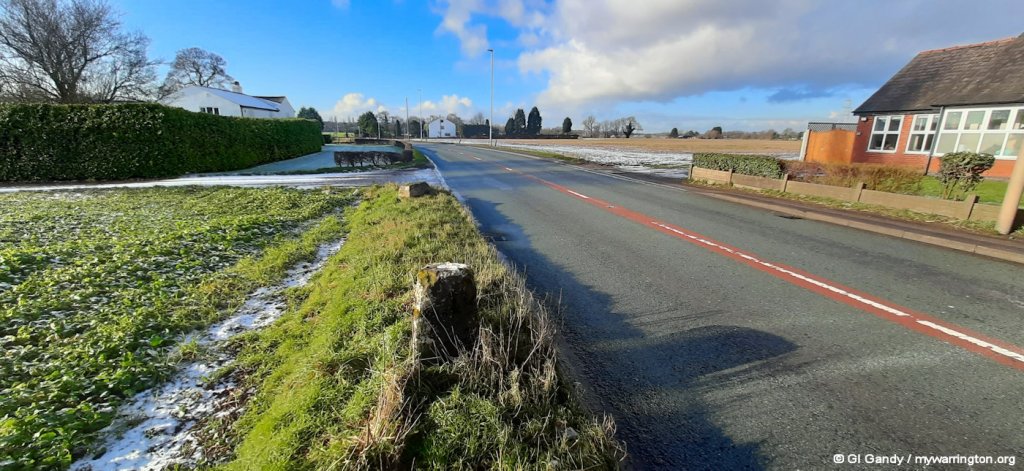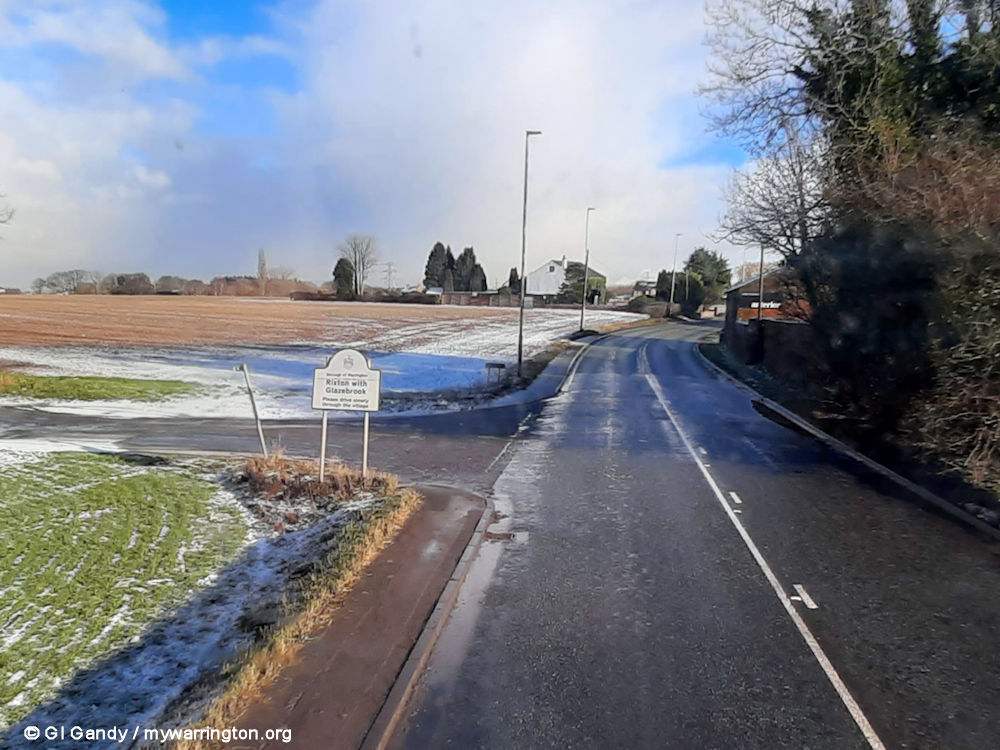 Rixton with Glazebrook is bordered with Woolston from the west. The boundary is seen here on Manchester Road at its junction with Brook Lane on 19 January 2023.