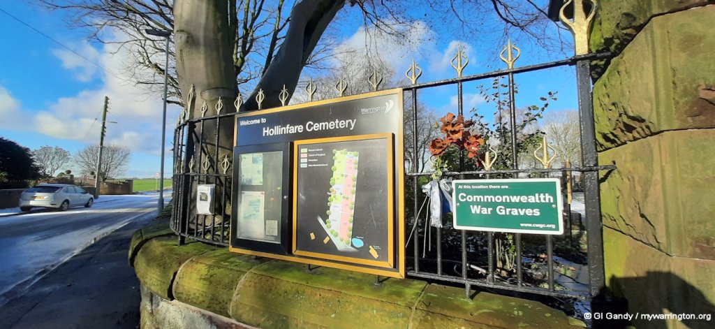 Hollinfare Cemetery on Dam Lane opposite St Helen Church was originally opened as a burial ground of the Warrington Rural District Council in the Parish of Rixton with Glazebrook. The first burial took place on 13 December 1894. Sadly it was for a one month old child named Herbert Hudson.