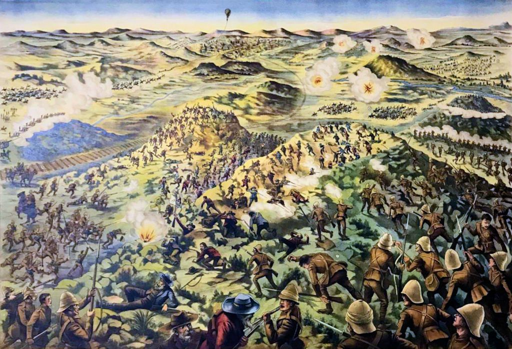 An illustration of the Battle of the Tugela Heights, in which the British can be seen driving the Boers off of Pieters Hill and removing the barrier to relieve Ladysmith. The besieged city can also be seen in the background.