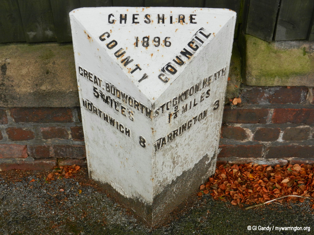 There is one milestone in Stretton. It is located on London Road south of Owen’s Corner roundabout and opposite the A49 road sign. It was installed in 1896 and is now a Grade II listed building (List Entry Number: 1392450), having received that status on 6 March 2008. It was made by W. H. Smith of Whitchurch. Nothing to do with the bookseller and stationer.