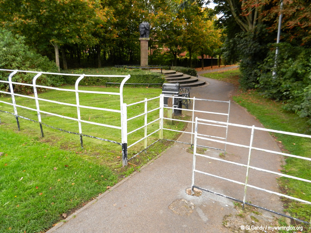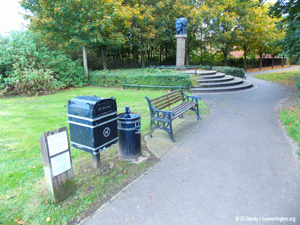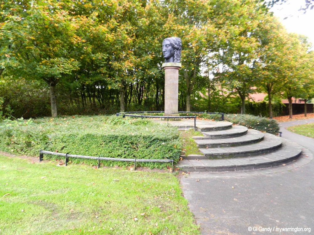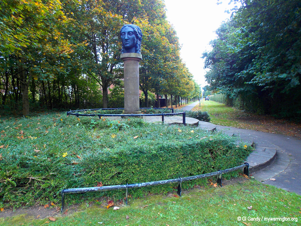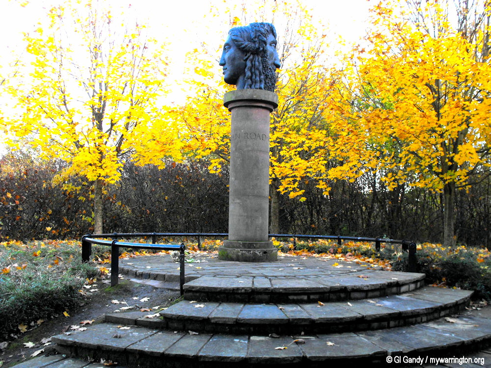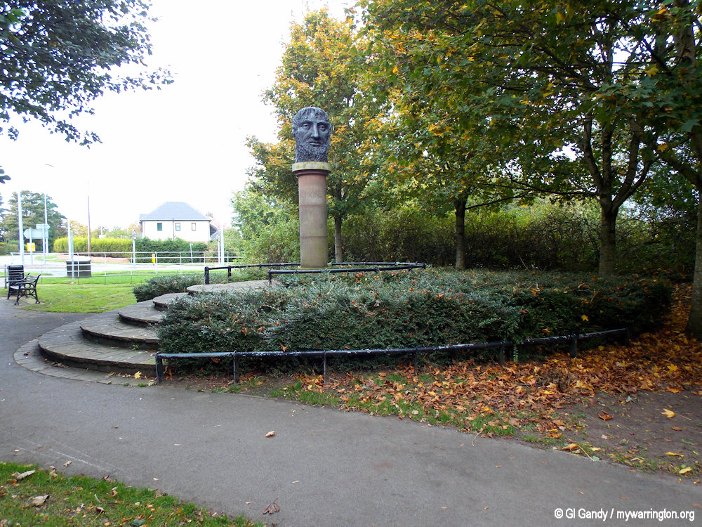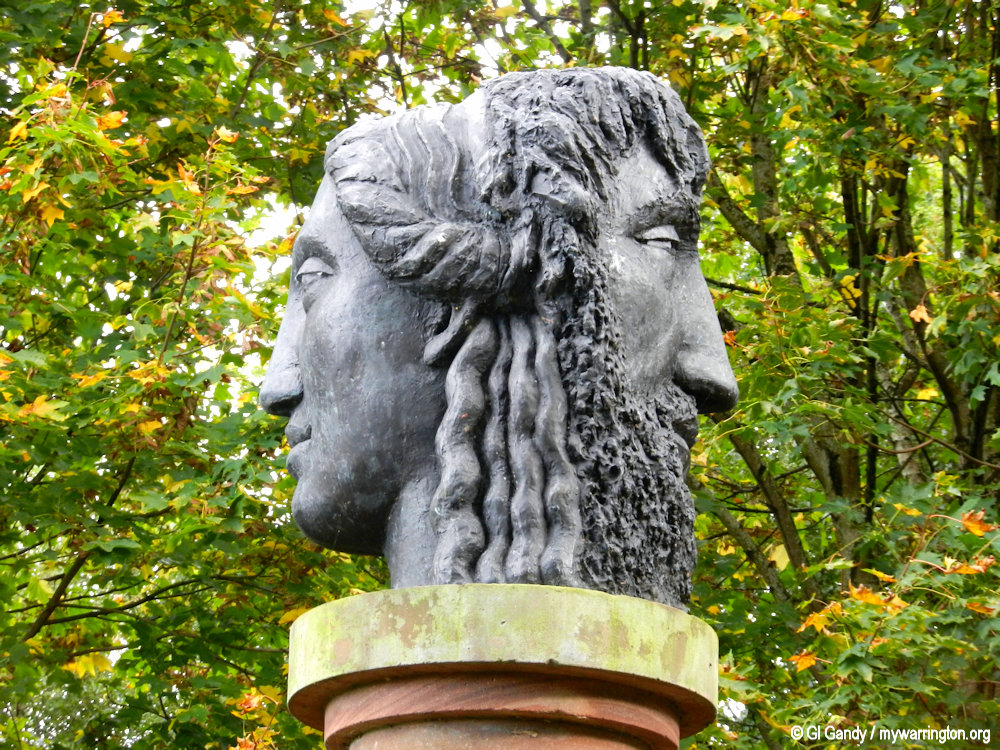 Photos of Pewterspear Green park showing a statue of the Roman god Janus on 11 October 2013.