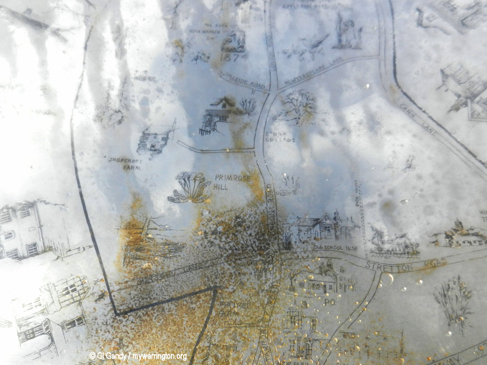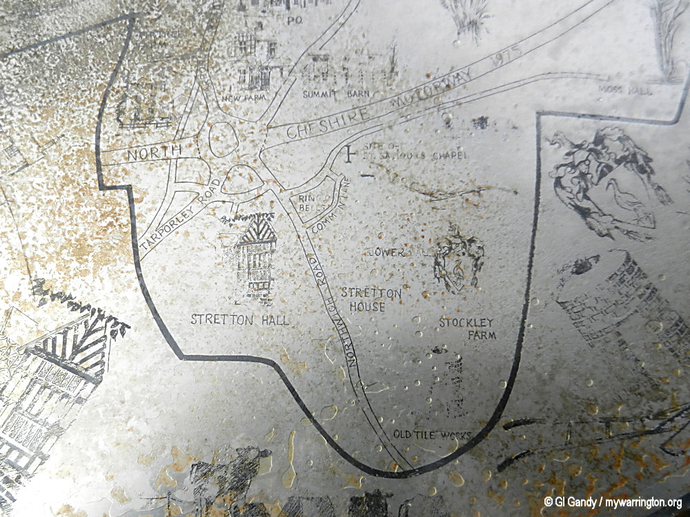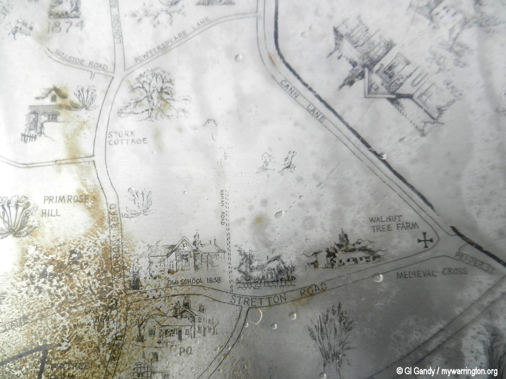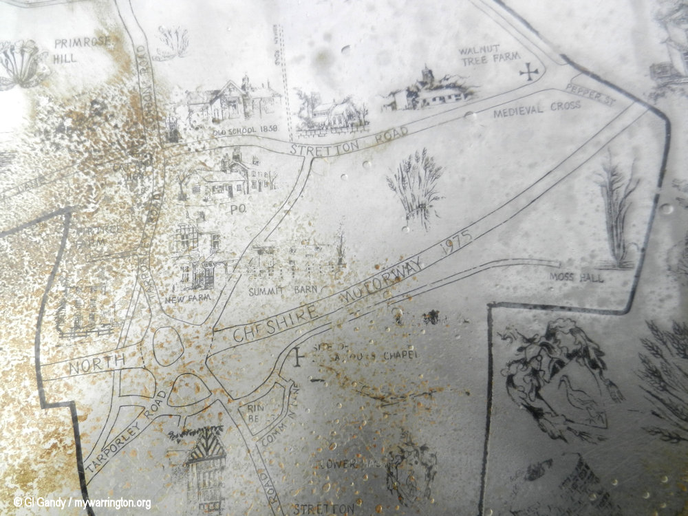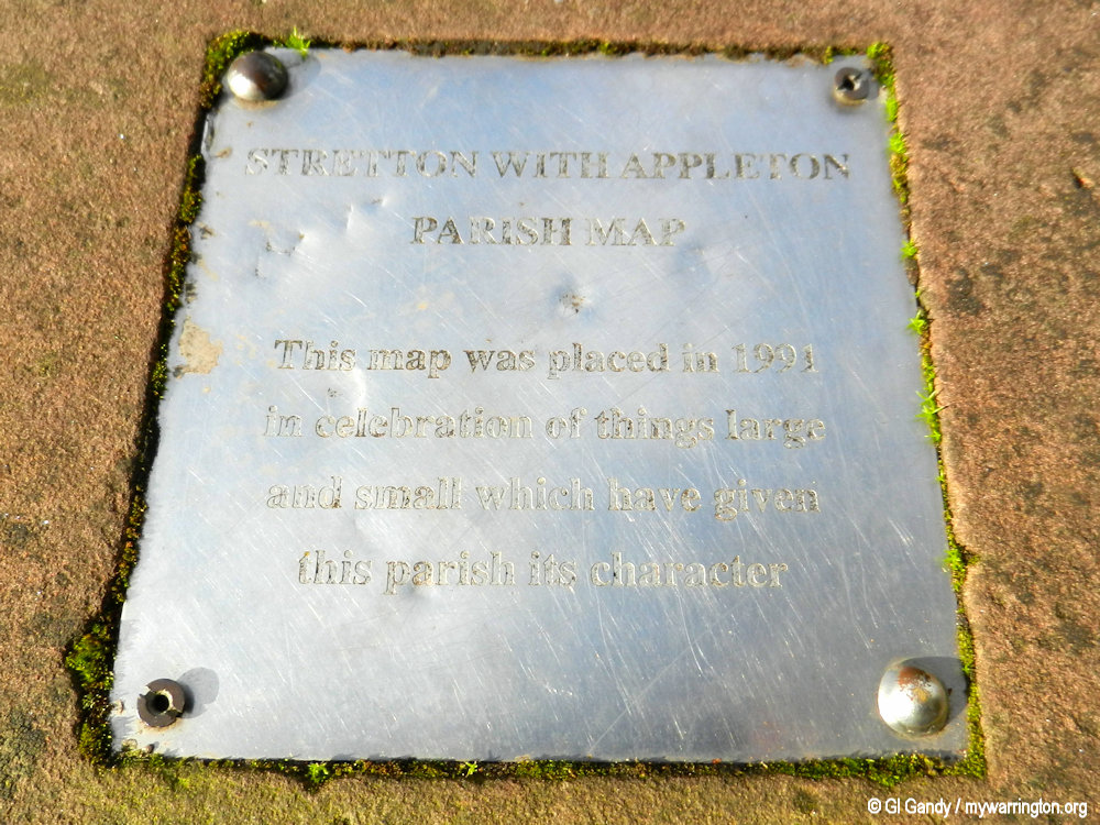In 1991 the Stretton with Appleton Parish Map was installed on a stone circle design along a pathway off Stretton Road. It has become affected by the weather over the years so the photos are the best that I can do.