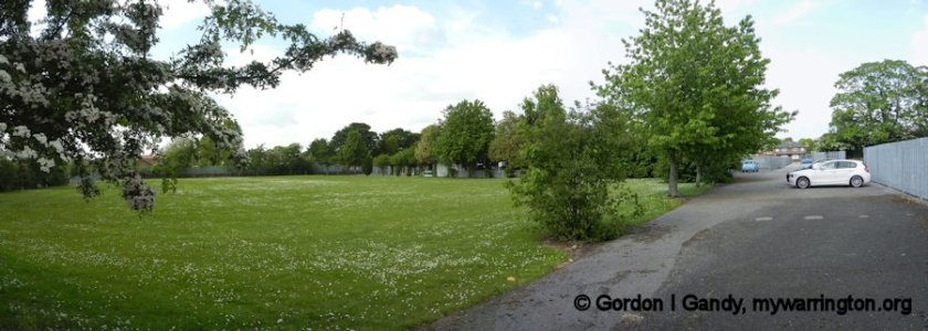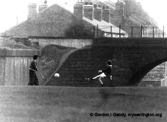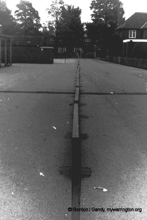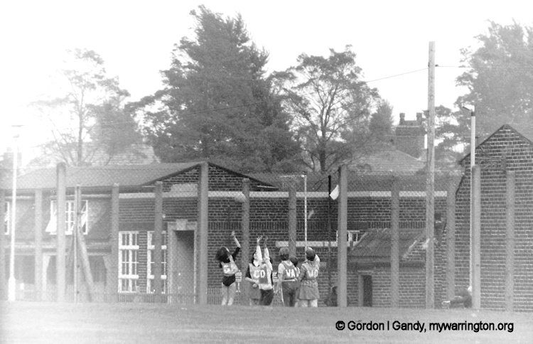 The school playing field with the Cheshire Lines Railway in the Background. This is the point where the railway split for the “straight” and “loop” sections, the “straight” section (nearest to the camera) had already closed in 1968. Read more about the Cheshire Lines Railway in Making Tracks. Photo taken in 1978.