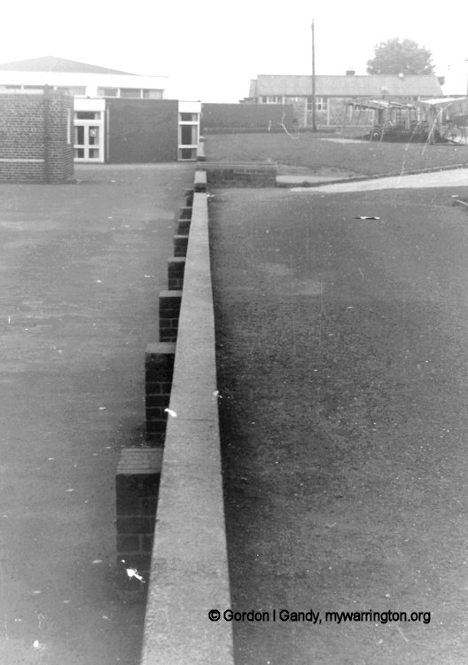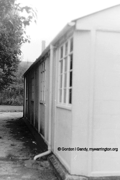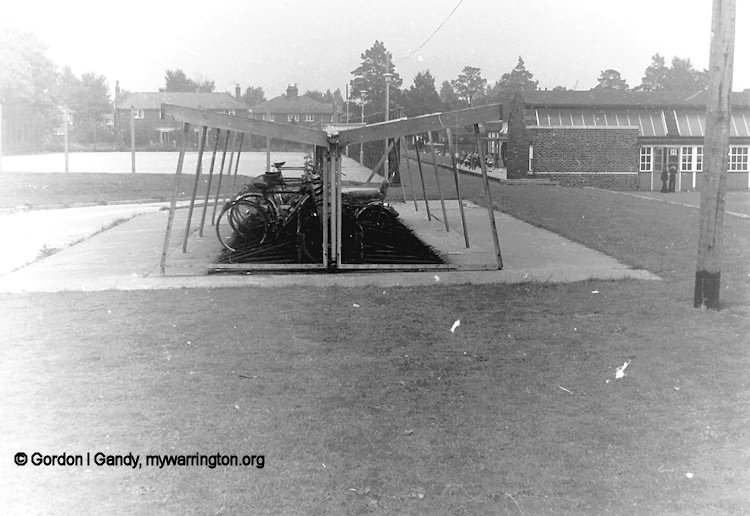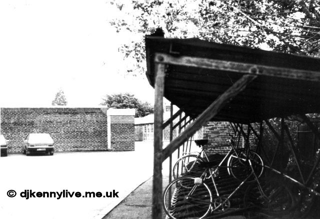 As you entered Clapgates Road entrance, these bike sheds were round the corner (The Cheshire Lines Railway ran behind the bike sheds). The boys’ toilet is the block in front of the car. Through the playground is one of the temporary classrooms to cater for the extra pupils. We waited by the bike sheds for the games master.