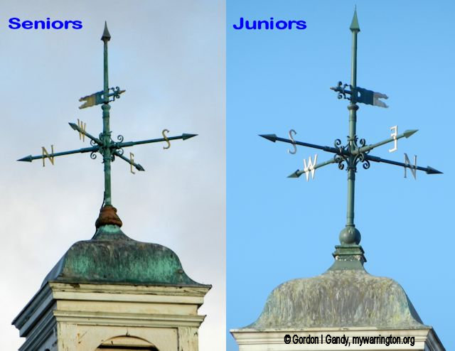 Both of the junior and senior schools had a weather vane on top. I hope the weather vane on the senior was kept for future use somewhere. However, the one on the junior school on Lodge Lane is still in place (seen here in the first photo on 18 May 2013). That school has had some alterations done to bring it into the 21st century. The weather vanes were identical and are seen together in the second photo.