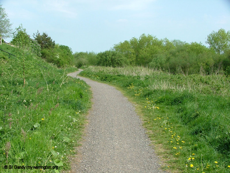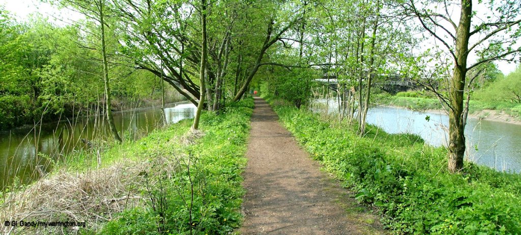 Moving east from Fiddler’s Ferry we travel past Gatewarth and Sankey Bridges, and then turn south to cross the Mersey via Forest Way, making our way under the West Coast Mainline railway bridge to the path between the Mersey and the section of water from the remains of the Runcorn and Latchford Canal near Chester Road.