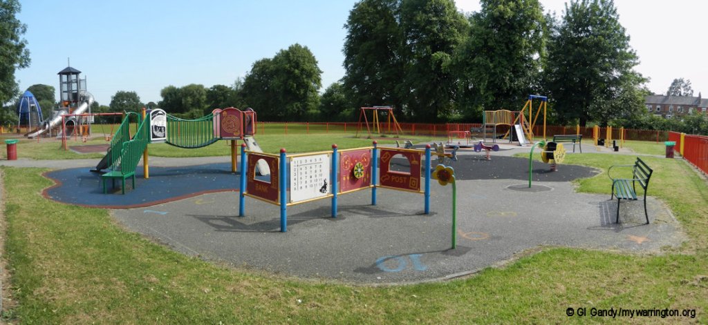 Victoria Park is on the site of the Old Warps Estate. In 1897 the local council bought the estate from the owners and converted it into a park to provide an amenity for the local working-class people of the terraced housing of industrial Latchford. To mark the Diamond Jubilee of Queen Victoria the park was named “Victoria Park”.