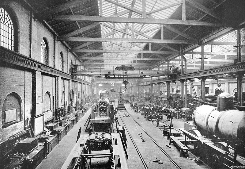 The erecting shop at the Crewe Locomotive Works ca. 1890. Image used under Creative Commons licence.